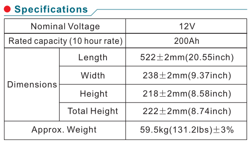 Specification for Rechargeable AGM Lead Acid Battery Pack 12V 200Ah for Auto Car